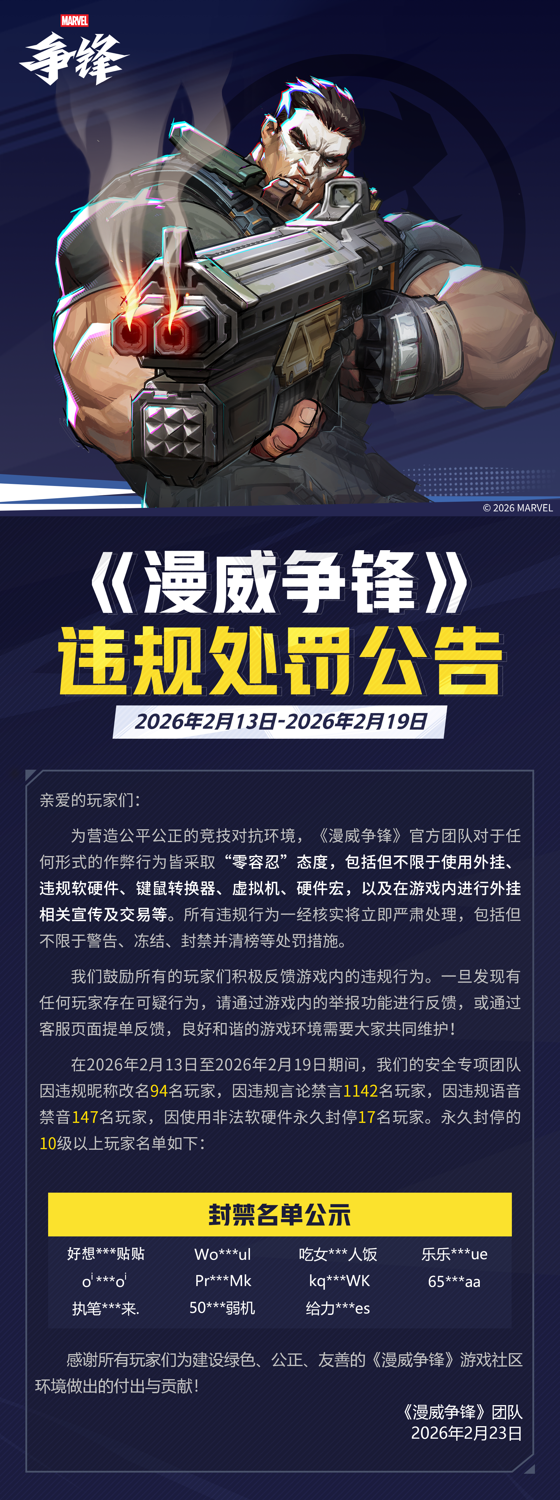 《漫威争锋》违规处罚公告(2026年2月13日-2026年2月19日)